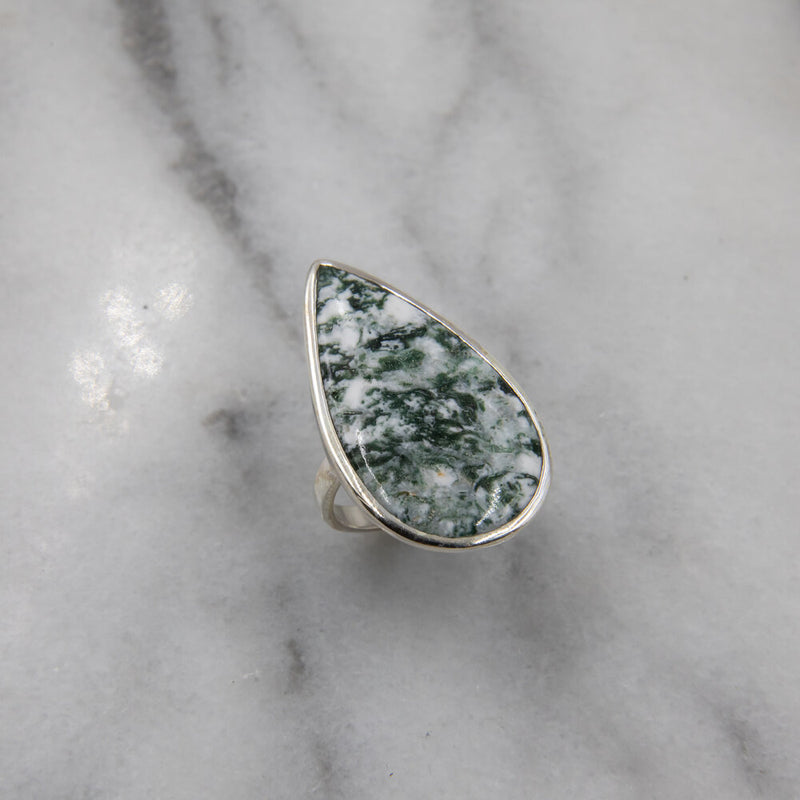 Stay true to your roots with our “Scarlet” tree Moss Agate ring. The interconnected moss like structure of this beautiful handcrafted piece will have you under its spell.